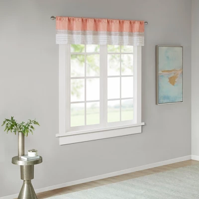 Salem’s modern color block design is a simple way to add style to any room. This window valance features color block stripes in soft hues of blush and ivory combined with pintuck detailing for beautiful texture and dimension. Added lining helps to filter the perfect amount of light and creates a fuller look. Hang using the rod pocket top. Fits up to 1.25″ diameter rod.