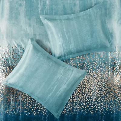 Elevate your bedroom with the glamorous style of the Madison Park Midnight Sky 3 Piece Metallic Print Duvet Set. The duvet cover features a satin charmeuse fabric top, in navy and gray hues, with a gold metallic foil print in the center, creating a stunning luxurious look. A solid navy microfiber reverse adds a soft touch and two matching shams complete the modern duvet cover set. Machine washable in a large capacity washer and dryer, this metallic print duvet cover set transforms your bedroom into a modern and glamorous space. A button closure helps secure a comforter insert within the duvet cover and inside ties in the corners help prevent it from shifting (insert is NOT included).