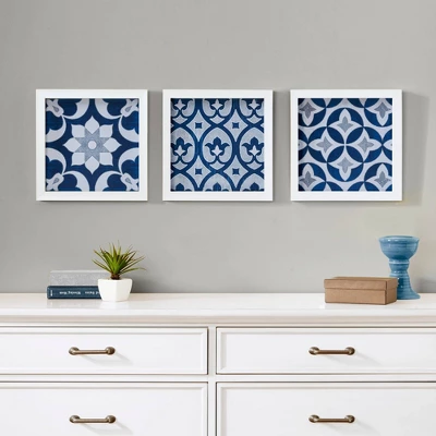 - Framed wall art set with 3 different distressed and textured tile patterns in blue, white and gray and solid white frame