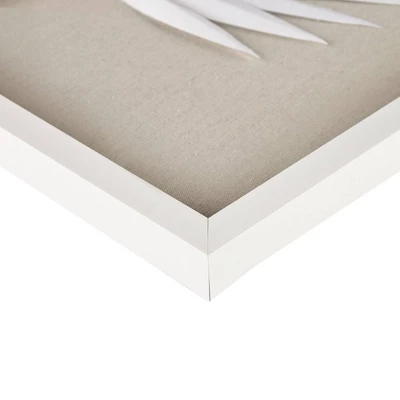 - Off white rice paper palms contrasted against a soft linen and protected by glass and white shadow box frame