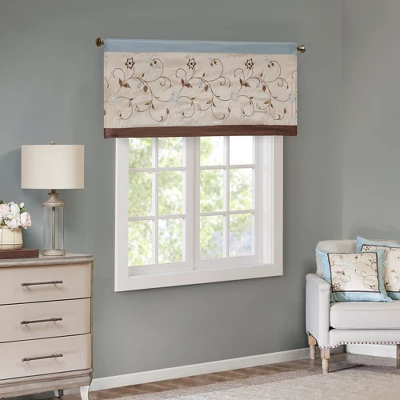 Add simple elegance to any room with the Monroe Embroidered Valance. This valance features delicate floral embroidery, offering beautiful contrast for a sophisticated look. The pieced and pleated details provide extra dimension and charm to your home decor, while added lining helps filter the perfect amount of sunlight into your home. Simply hang on 3″ rod pocket, fits up to a 1.25″ diameter rod.