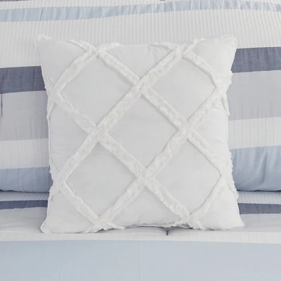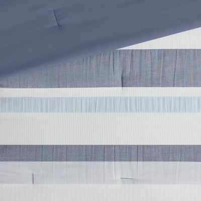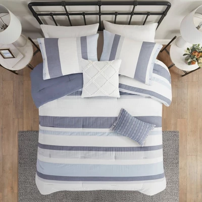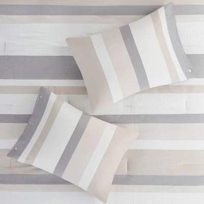 Refresh your bedroom with the casual charm of Madison Park’s Roman 5 Piece Jacquard Comforter Set. The jacquard comforter features a striped design for an updated casual look. The matching shams pair handsomely with the farmhouse-inspired comforter, while an oblong and a square decorative pillow add textural elements to the comforter set. Hypoallergenic polyester filling in the comforter and pillows provides exceptional warmth and comfort all through the night. Machine washable for easy care, this jacquard comforter set has an antimicrobial treatment that provides built-in freshness protection, inhibits growth of odor causing bacteria, and keeps the fabric newer, longer. Bedding may come in rolled or compressed packing and will need to be fluffed up. Use a steam iron to help remove wrinkles easier.
