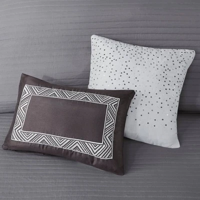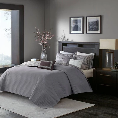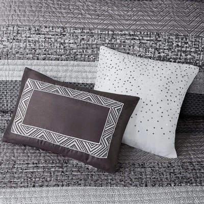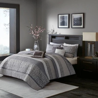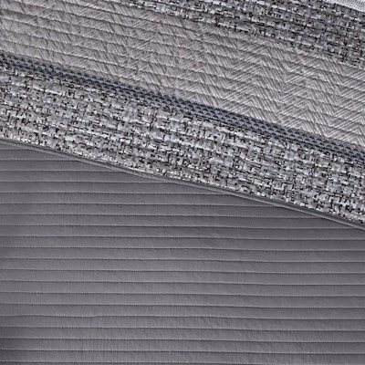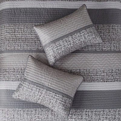 Add a fresh look to your bedroom with the 6pc Harmony Polyester Jacquard Quilted Coverlet Set. This woven jacquard stripe features several different small motifs within the stripe for added dimension to this collection. Three decorative pillows use fabric manipulation and embroidery techniques to tie this whole look together. Machine washable for easy care, this quilted jacquard coverlet set brings an extravagant and stylish touch to your bedroom.