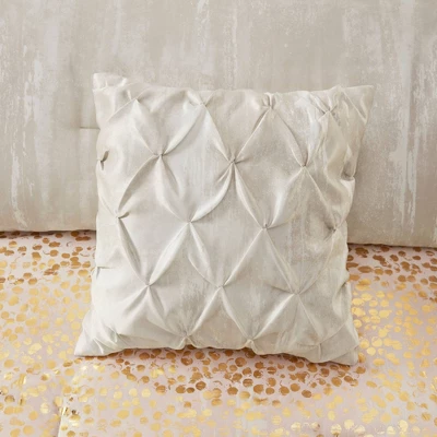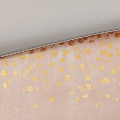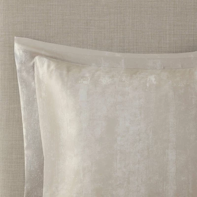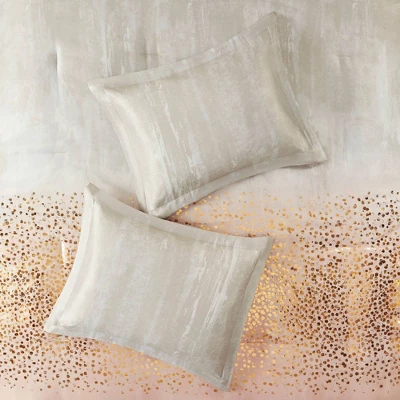 Elevate your bedroom with the glamorous style of the Midnight Sky 7 Piece Metallic Print Comforter Set. The comforter features a satin charmeuse fabric top with a metallic foil print in the center, creating a stunning luxurious look. A solid microfiber reverse adds a soft touch and two matching shams complete the modern comforter set. Three decorative pillows with embroidery and pleating details as well as a solid bed skirt provide the perfect finishing touches. Machine washable in a large capacity washer and dryer, this metallic print comforter set transforms your bedroom into a modern and glamorous space. Items in the set may come in a rolled or compressed packaging, which will need to be fluffed up or steam ironed before use to remove wrinkles.