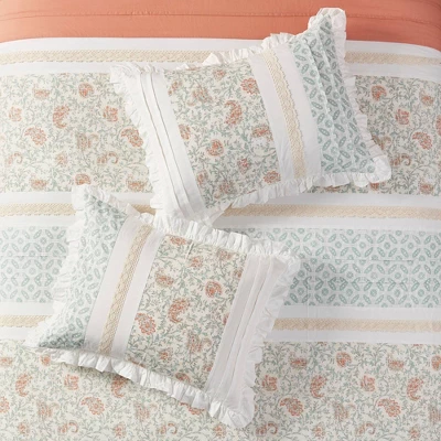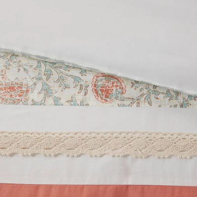 The Stella Cotton Percale Comforter Set offers a shabby chic update to your bedroom decor. A paisley print is featured on the cotton comforter with pintucked fabric separated by lace taping embellishments. Around the edge, a ruched flange adds a graceful touch, for a charming cottage look. Matching shams mirror the design of the comforter, while 2 solid Euro shams complement the top of the bed. The 3 decorative pillows and a solid bedskirt complete this farmhouse comforter set. This bedding set is also OEKO-TEX certified, meaning it does not contain any harmful substances or chemicals to ensure quality comfort and wellness. A coordinating shower curtain is available and sold separately.
