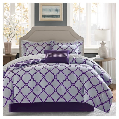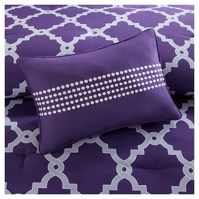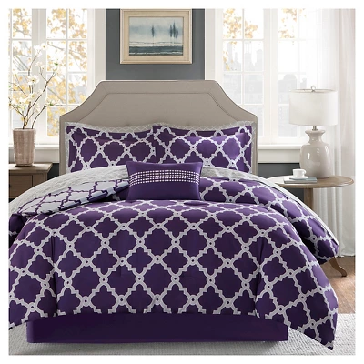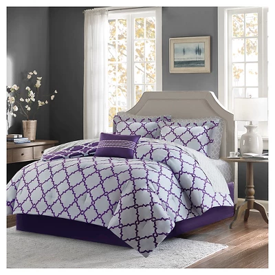 The Becker Reversible Complete Comforter and Cotton Sheet Set adds a simple yet chic look to your space. The comforter features a fretwork design against a vivid base that flips the color scheme on the reverse, for two distinct modern looks. Matching shams (1 in Twin Sizes) mirror the design on the face of the comforter, while an embroidered decorative pillow and solid bedskirt complete the bedding set. The included 100% cotton printed sheet set features a smaller scale fretwork pattern that complements the comforter. Bringing the best in health and wellness, this bedding set also features an anti-microbial treatment that provides built-in freshness protection, reducing the growth of odor causing bacteria and keeps fabric lasting longer. This bedding set is also OEKO-TEX certified, meaning it does not contain any harmful substances or chemicals, ensuring quality comfort and wellness. Items in the set may come in a rolled or compressed packaging, which will need to be fluffed up or steam ironed before use to remove wrinkles.