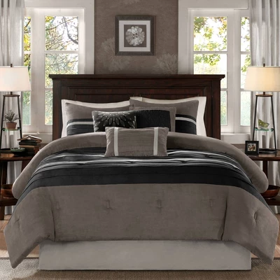 The Dakota 7 Piece Comforter Set offers a classic and refined update to your bedroom decor. This transitional style comforter features a pieced microsuede design in rich contrasting colors to create an incredibly soft look and feel. The 2 matching shams also flaunt a pieced construction to coordinate with the faux suede comforter. A solid bed skirt and 3 decorative pillows with a mix of embroidered designs add the perfect finishing touches to complete this lush traditionally-inspired comforter. Machine washable for easy care, items in the set may come in a rolled or compressed packaging, which will need to be fluffed up or steam ironed before use to remove wrinkles.