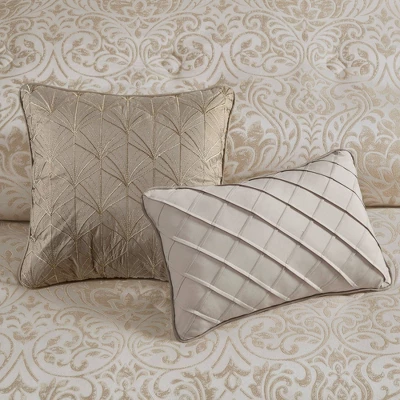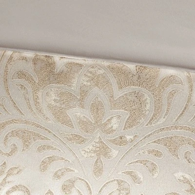 The Madison Park Grace 12 Piece Jacquard Comforter Set will add elegance to your bedroom. The comforter and shams have a damask pattern in gold metallic thread that shines on the jacquard fabric, creating a refined look. The comforter is paired with two Euro shams and a bedskirt in a solid dark khaki that matches well. Also provided is a microfiber sheet set in a soft egg-shell white and 2 decorative pillows to complete the look.