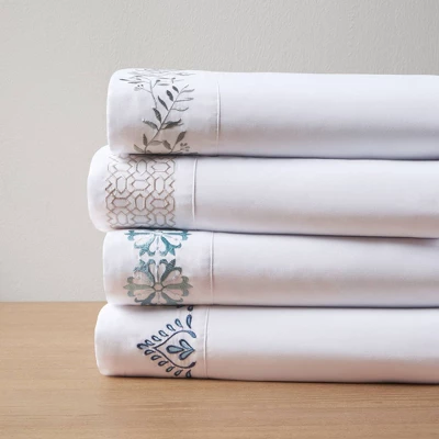 Style your bed with the simple elegance of the Madison Park Embroidered Microfiber Sheets. This solid microfiber sheet set features a beautiful embroidered hem that adds a refined touch and brings a pop of color to your bedroom. Embroidery is featured on the flat sheet and pillowcase hem face side only. The fitted sheet fits mattresses up to 16″. Made from ultra-soft microfiber, this casual sheet set provides a charming and comfy addition to your bedroom decor. This microfiber sheet set is also OEKO-TEX certified, meaning it does not contain any harmful substances or chemicals to ensure quality comfort and wellness. Set includes: 1 Flat Sheet, 1 Fitted Sheet, and 2 Pillowcases. Machine washable for easy care.