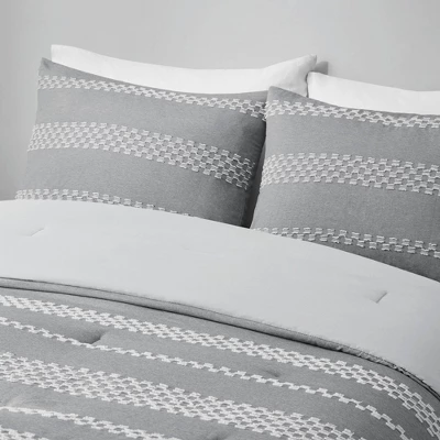 Artistically designed, this striped comforter set revitalizes your bed with bold style and refined comfort. The comforter features a contrasting clipped jacquard stripe design with a solid light gray reverse to create texture and dimension. Handsomely tailored matching shams and 2 decorative pillows provide the finishing touches to this expertly crafted casual bedding set.