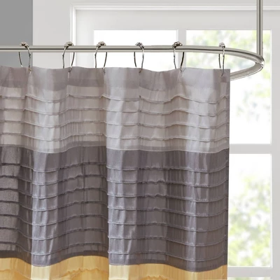 Update your bath space while creating an enclosed bathing space with this Faux-Silk Pieced Shower Curtain. Showcasing a stylish colorblock design and pleated detailing for a contemporary look, this fabric shower curtain lends beautiful texture to your space, while easily coordinating with a variety of decor styles and color palettes. Made from soft and lightweight faux-silk fabric for effortless draping, this faux-silk shower curtain comes with a sturdy buttonhole top for quick hanging and is machine washable for easy care. Pattern layout may vary due to variation of sizes. Durable and decorative, this gorgeous shower curtain ensures privacy while refreshing your space with effortless charm.
