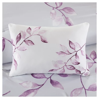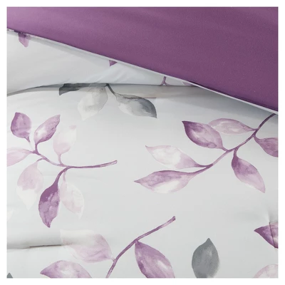 The Madison Park Essentials Lafael Complete Comforter and Cotton Sheet Set offers a charming update for your bedroom. The grey comforter showcases purple and dark grey leaves with a solid purple reverse, for a vivid floral look. Matching shams (1 for Twin Sizes) and an embroidered decorative pillow accentuate the floral motif. Also included is a purple cotton sheet set with an ogee print that harmonizes with the comforter set. Bringing the best in health and wellness, this bedding set also features an anti-microbial treatment that provides built-in freshness protection, reducing the growth of odor causing bacteria and keeps fabric lasting longer. This bedding set is also OEKO-TEX certified, meaning it does not contain any harmful substances or chemicals, ensuring quality comfort and wellness. This bedding set may come in rolled or compressed packing and will need to be fluffed up. Use a steam iron to help remove wrinkles easier.