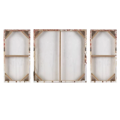 Create a serene atmosphere in your home with the Autumn Forest Palette Knife Embellished 3pc Canvas Art Set. A forest scene is displayed across each canvas of this 3pc set for a calm transitional look. Palette knife embellishments made by hand add texture and dimension to the canvases, while two D-rings make it easy to mount them on your wall. The largest canvas measures 27″x27″ and the two identical side canvases measure 13.5″x27″. Ideal for any room, this 3pc canvas wall art set offers a charming transitional touch to your home decor. Spot clean only.