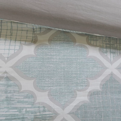 Freshen up your space with the modern style of the Sidnee 9 Piece Cotton Sateen Comforter Set. Flaunting a geometric print, in vivid hues, this comforter features printed metallic details with a solid reverse, for a contemporary appeal. Matching shams complement the comforter, while three decorative pillows with embroidery and fabric manipulation add charm and texture to the top of the bed. A solid bed skirt completes the look with a clean finish. Two pillowcases with geometric embroidery along the hems are also included. Made from cotton sateen, this bedding set is OEKO-TEX certified, meaning it does not contain any harmful substances or chemicals to ensure quality comfort and wellness. Items in the set may come in a rolled or compressed packaging, which will need to be fluffed up or steam ironed before use to remove wrinkles.